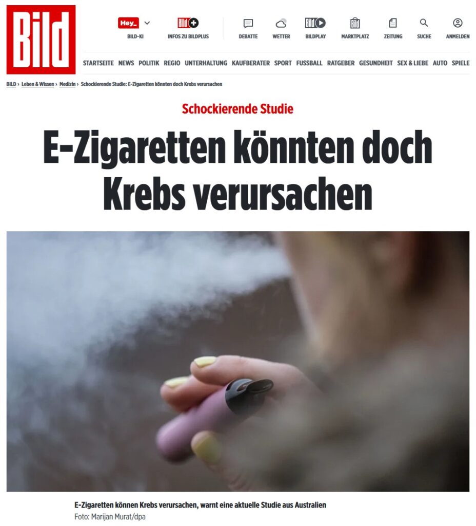 Ganz anders klang die Berichterstattung über einen Artikel, der am 30. März im Fachmagazin „Carcinogenesis“ erschienen ist und u. a. über mögliche DNA-Schäden durch den Konsum von E-Zigaretten berichtet. Daraus wurde ein potenzielles Krebsrisiko abgeleitet – und in mehreren Ländern mit entsprechend zugespitzten Schlagzeilen medial berichtet. Selbstverständlich verdienen auch solche Studienergebnisse Aufmerksamkeit. Sie sollten jedoch mit größter wissenschaftlicher Sorgfalt geprüft und eingeordnet werden.