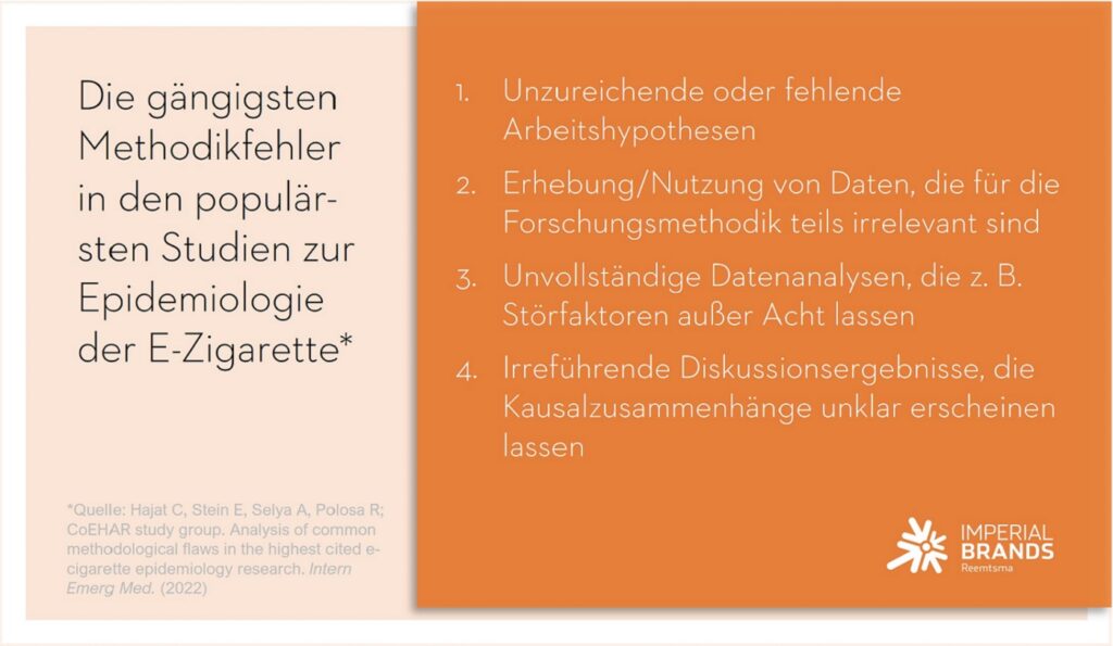 Am 24. März 2022 veröffentlichte ein Team von Wissenschaftler:innen um den italienischen Professor Riccardo Polosa von der Universität Catania eine Studie mit dem Titel „Analysis of common methodological flaws in the highest cited e-cigarette epidemiology research”*. Polosa ist Professor für Innere Medizin, renommierter Spezialist für Atemwegserkrankungen und klinische Immunologie an der Universität von Catania und Gründer des Zentrums für Tabakforschung. Er beschäftigt sich schwerpunktmäßig mit dem Themenkomplex „Tobacco Harm Reduction“, also der Minderung negativer gesundheitlicher Auswirkungen des Konsums herkömmlicher Tabakprodukte, etwa durch potenziell weniger schädliche Alternativen wie die E-Zigarette.