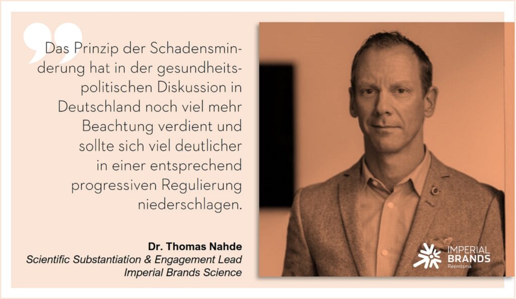 Dr. Thomas Nahde, Scientific Substantiation and Engagement Lead bei der Reemtsma-Muttergesellschaft Imperial Brands, ergänzt: „Der absolute Rauchstopp und der Verzicht auf jede Form des Konsums von Nikotin sind für die individuelle Gesundheit immer die beste Alternative. Wer hingegen kein Interesse daran hat, für den stellen neuartige Produkte wie tabakfreie Nikotinbeutel eine gute Alternative dar, um das eigene gesundheitliche Risiko potenziell deutlich zu senken. Das Prinzip der Schadensminderung hat in der gesundheitspolitischen Diskussion in Deutschland noch viel mehr Beachtung verdient und sollte sich viel deutlicher in einer entsprechend progressiven Regulierung niederschlagen.“